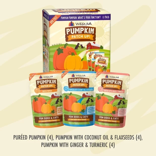 Itās just as good as a pumpkin spice coffeeāitās the Weruva Pumpkin Patch Up! Pumpkin Pumpkin, Whatās Your Function? Variety Pack. Your pet will be salivating over pumpkin puree, a great ingredient for stool and gut health, as well as anti-inflammatory ginger and turmeric and rich, fibrous coconut oil and flaxseeds. Each flavor comes in an easy-to-serve, BPA-free pouch, ready to become a meal topper or a simple yet fun frozen treat. Soothe that tummy or get a shiny, healthy coat with this yummy supplemental puree!
