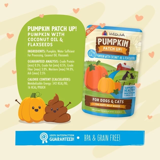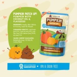 A happy tummy for your pooch or kitty is just a few bites away with Weruva Pumpkin Patch Up! Pumpkin With Coconut Oil & Flaxseeds Wet Food Topper. Pumpkin is a superfood for your super pet! It’s full of soluble and insoluble fibers that support gut and stool health, so it’s great against ailments such as an upset stomach or diarrhea. Plus, coconut oil and flaxseeds provide fatty acids and fiber for gut and stool wellbeing. Simply top off your pet’s meal with this versatile, yummy puree, or freeze it into a fun treat!