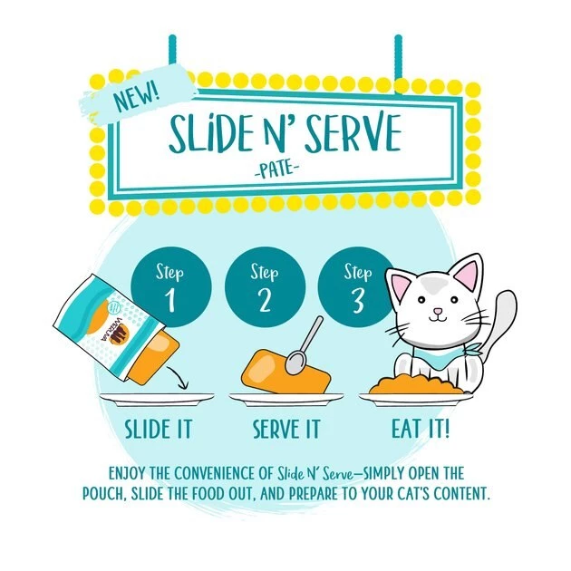 - Each serving comes in an easy-to-use recyclable Slide N’ Serve pouch—simply open the pouch, slide the food out and prepare to your cat’s content.