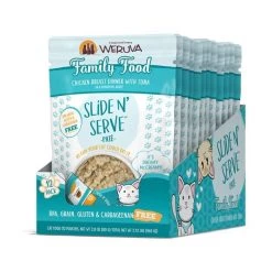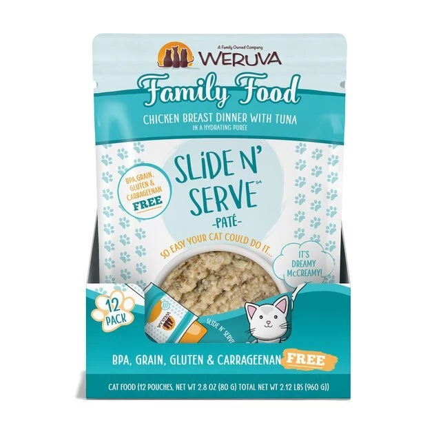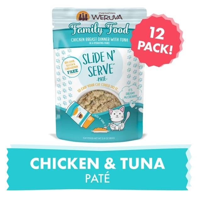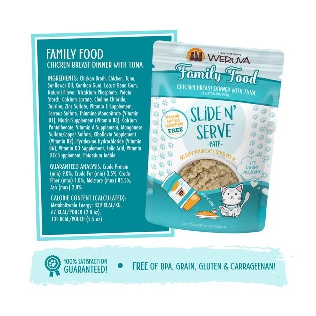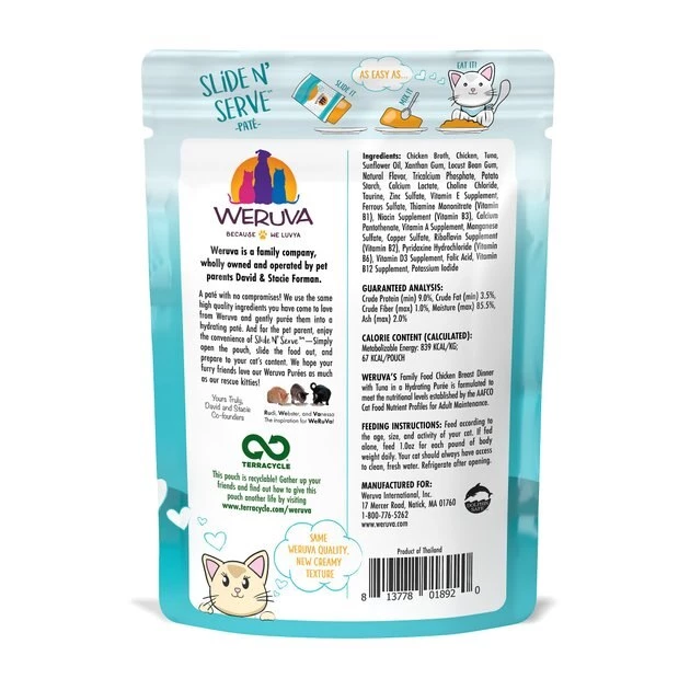 Do pate the right way with Weruva Slide N’ Serve Family Food Chicken Breast Dinner with Tuna. Each recyclable pouch holds a complete and balanced meal of pate made with savory chicken broth, chicken and tuna as the top three ingredients. Plus, every pet parent will enjoy Weruva’s convenient Slide N’ Serve packaging—simply open the pouch, slide the food out and prepare to your cat’s purr-eference. Best of all, every Slide N’ Serve recipe is grain-free, gluten-free and carrageenan-free, so you can feed your cat with complete confidence!