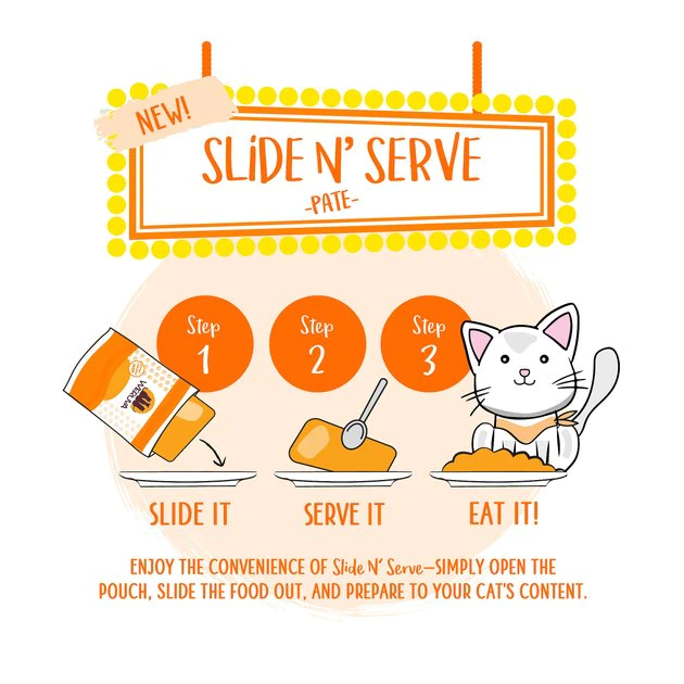 - Each serving comes in an easy-to-use recyclable Slide N’ Serve pouch—simply open the pouch, slide the food out and prepare to your cat’s content.