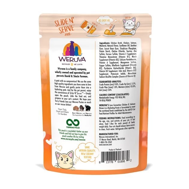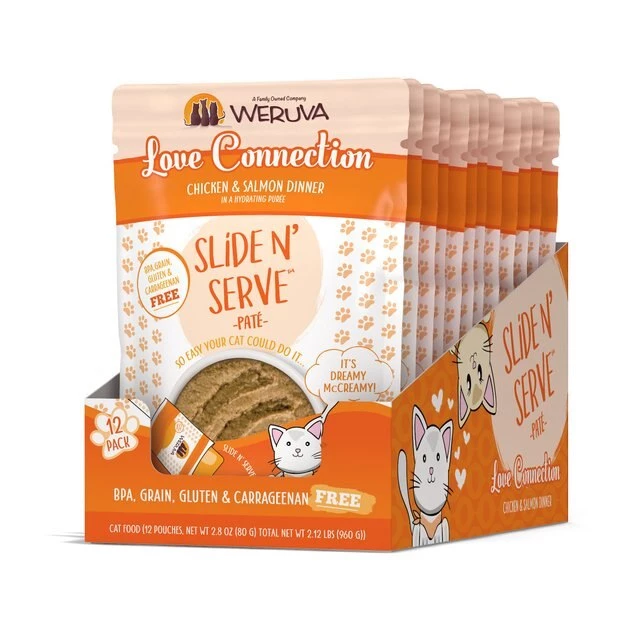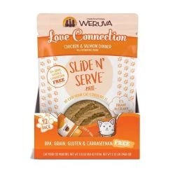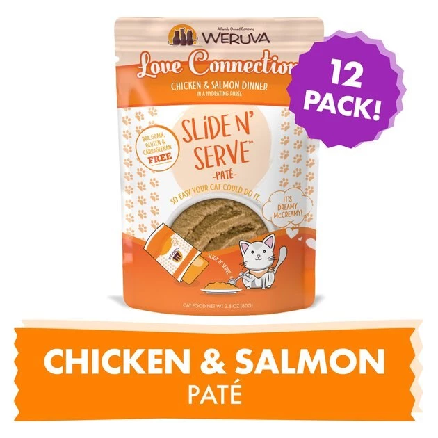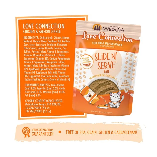 Show your cat some extra love by feeding her Weruva Slide N’ Serve Love Connection Chicken & Salmon Dinner Pate. Each recyclable pouch holds a complete and balanced meal of pate made with savory chicken broth, chicken, salmon and mackerel as the top ingredients. Plus, every pet parent will enjoy Weruva’s convenient Slide N’ Serve packaging—simply open the pouch, slide the food out and prepare to your cat’s purr-eference. Best of all, every Slide N’ Serve recipe is grain-free, gluten-free and carrageenan-free, so you can feed your cat with complete confidence.