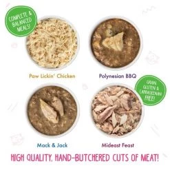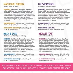Mideast Feast: 211 kcal/10-oz can; Mack & Jack: 469 kcal/10-oz can; Polynesian BBQ: 258 kcal/10-oz can; Paw Lickin’ Chicken: 188 kcal/10-oz can