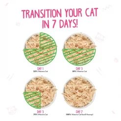 Weruva always recommends switching your cat or dog’s diet slowly and to adjust according to your pet’s digestive stability. Typically, a 6 day transition suites most pet’s needs. We recommend feeding a mix of 25% Weruva & 75% of the previous food for the first 2 days. For the next 2 days, feed 50% Weruva & 50% of the previous diet. Days 5 & 6, Feed 75% Weruva with 25% of the previous diet. Your pet should be fully adjusted to an exclusive high-quality Weruva diet thereafter.