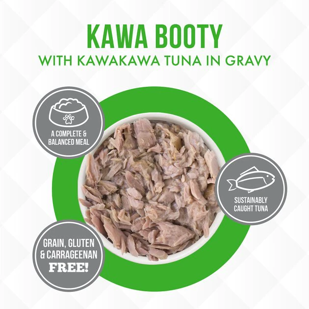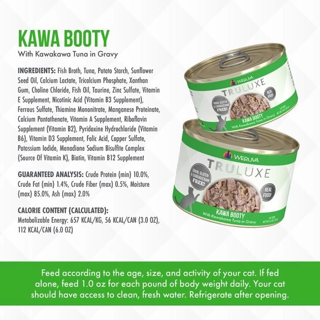 Fuel your little carnivore’s adventures with the Weruva Truluxe Kawa Booty with Kawakawa Tuna in Gravy Grain-Free Canned Cat Food. Made with wild-caught Kawakawa tuna—a premium fish from tropical waters—as the first ingredient, every juicy bite is loaded with the meat your pal craves, and all the protein he needs for healthy muscles. Since it’s formulated with a perfectly-balanced blend of vitamins, minerals and heart-healthy taurine, every easy-open can is actually a complete meal—on its own or as a tasty kibble topper. Your kitty will love the meaty morsels and luscious gravy that also provides plenty of hydration so he can stay healthy, from nose to tail. It’s no wonder that for cats everywhere, Weruva is also known as “the best cat food under the sun!”