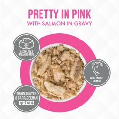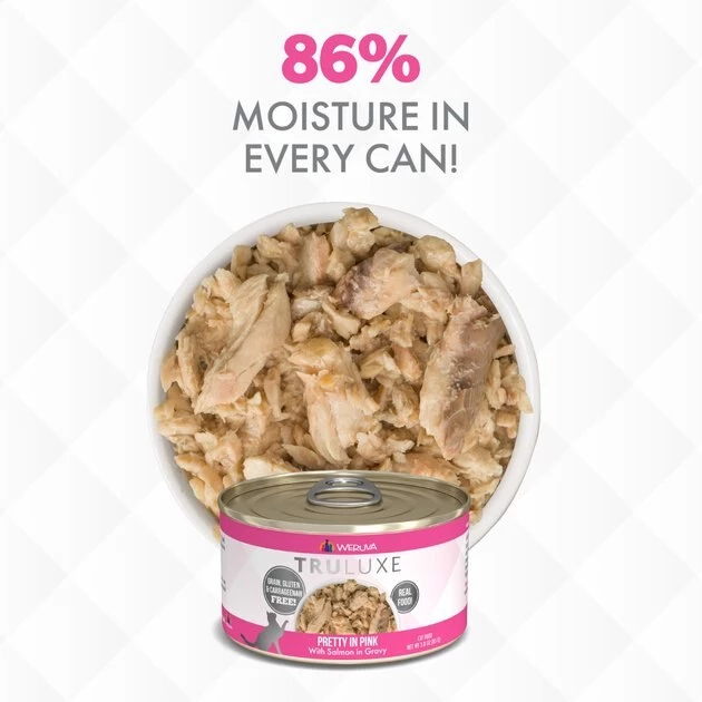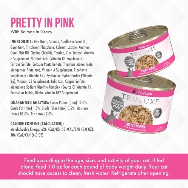Fuel your little carnivore’s adventures with the Weruva Truluxe Pretty In Pink with Salmon in Gravy Grain-Free Canned Cat Food. Made with salmon and fish broth as the top ingredients, every juicy bite is loaded with the meat your pal craves, and all the protein he needs for healthy muscles. Since it’s formulated with a perfectly-balanced blend of vitamins, minerals and heart-healthy taurine, every easy-open can is actually a complete meal—on its own or as a tasty kibble topper. Your kitty will love the meaty morsels and luscious gravy that also provides plenty of hydration so he can stay healthy, from nose to tail. It’s no wonder that for cats everywhere, Weruva is also known as “the best cat food under the sun!”