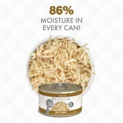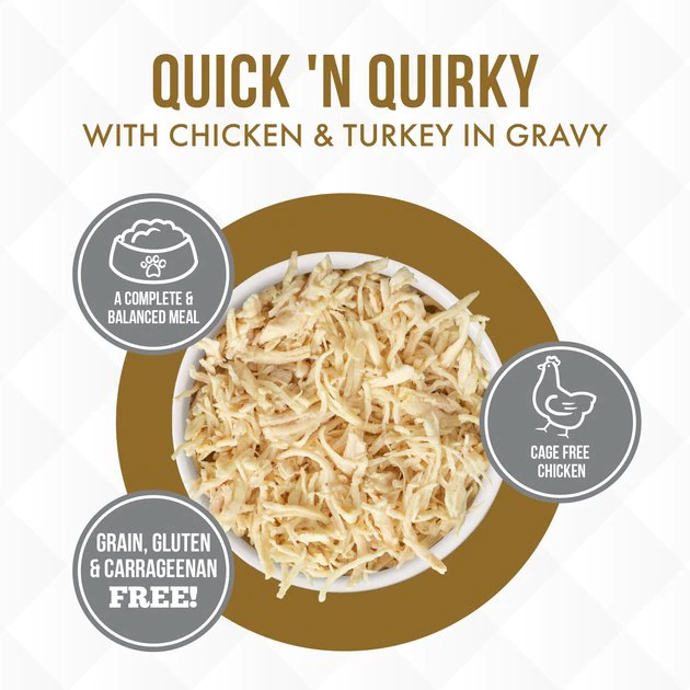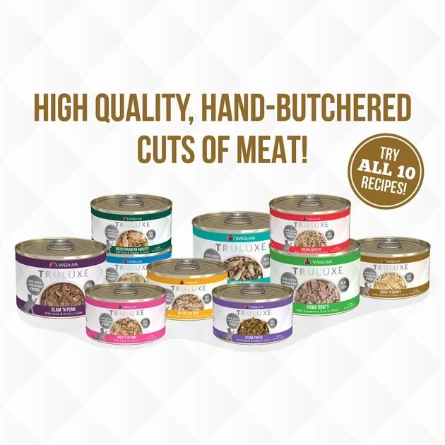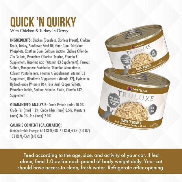 Fuel your little carnivore’s adventures with the Weruva Truluxe Quick ‘N Quirky with Chicken & Turkey in Gravy Grain-Free Canned Cat Food. Made with chicken broth, chicken and turkey as the top ingredients, every juicy bite is loaded with the meat your pal craves, and all the protein he needs for healthy muscles. Since it’s formulated with a perfectly-balanced blend of vitamins, minerals and heart-healthy taurine, every easy-open can is actually a complete meal—on its own or as a tasty kibble topper. Your kitty will love the meaty morsels and luscious gravy that also provides plenty of hydration so he can stay healthy, from nose to tail. It’s no wonder that for cats everywhere, Weruva is also known as “the best cat food under the sun!”