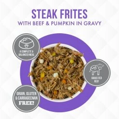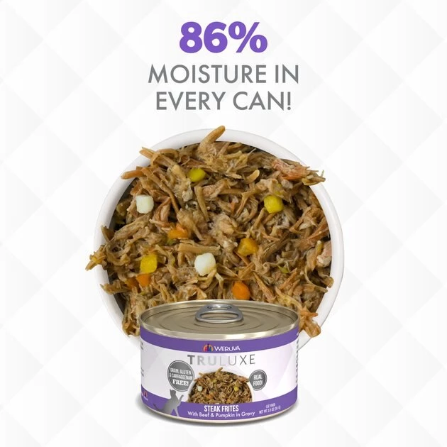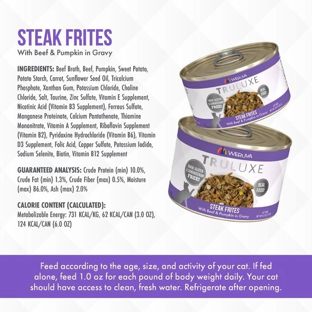 Fuel your little carnivore’s adventures with the Weruva Truluxe Steak Frites with Beef & Pumpkin in Gravy Grain-Free Canned Cat Food. Made with grass-fed beef and pumpkin as the top ingredients, every juicy bite is loaded with the meat your pal craves, and all the protein he needs for healthy muscles. Since it’s formulated with a perfectly-balanced blend of vitamins, minerals and heart-healthy taurine, every easy-open can is actually a complete meal—on its own or as a tasty kibble topper. Your kitty will love the meaty morsels and luscious gravy that also provides plenty of hydration so he can stay healthy, from nose to tail. It’s no wonder that for cats everywhere, Weruva is also known as “the best cat food under the sun!”