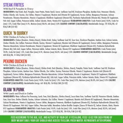 Steak Frites: 62 kcal/3-oz can; Quick ‘N Quirky: 51 kcal/3-oz can; Peking Ducken: 56 kcal/3-oz can; Glam ‘N Punk: 104 kcal/3-oz can